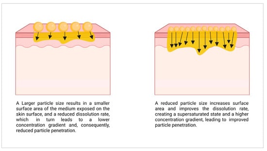 The penetration-improving effect of particles is concentration- and size-dependent. In particular, particle-assisted dermal penetration is higher with greater amounts of particles and smaller particle sizes within the formulation [120]. Particle-assisted dermal penetration can be achieved by adding nanocrystals to formulations well above the saturation solubility of the active compound. This effect was already shown for nanocrystals in 2016 [78] and subsequently understood and confirmed in 2022 [119].