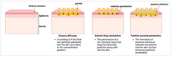In principle, there are three major pathways through which active ingredients can enter the skin. The first mechanism is passive diffusion. This means that the active ingredient must be dissolved in the vehicle, from which it diffuses to the skin surface and then into the skin. This principle is explained by Fick’s first law [8,116] as in Equation (2).