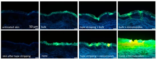 Visualizing the combined effect of nanocrystals and microneedle devices with images from vertical skin sections (porcine skin) obtained by inverted epifluorescence microscopy, in which green fluorescence indicates penetration of nanocrystals. Nanocrystals improve the dermal penetration of curcumin in comparison to larger-sized bulk material with a size of about 10 µm. Also, manipulation of the skin improves the dermal penetration. However, combining nanocrystal technology with microneedles resulted in a synergistic dermal delivery enhancement [138,139].