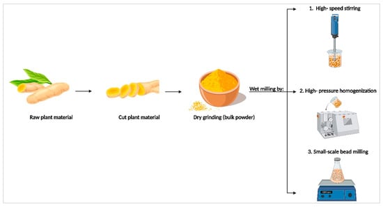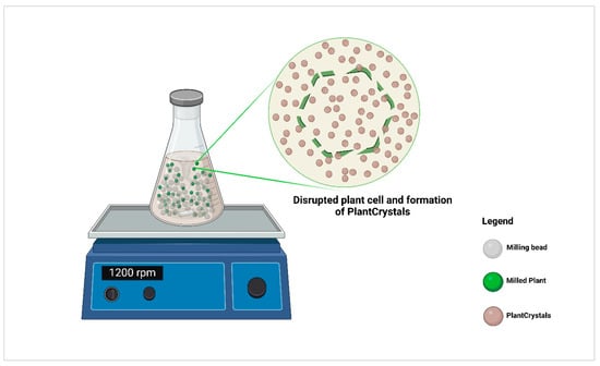 PlantCrystals are produced by dispersing the plant material, either in powder form or as an aqueous dispersion, into a stabilizer solution (e.g., surfactant) to prevent agglomeration over time [168]. The production can be performed on a laboratory scale or a large scale by using the same equipment used for the production of nanocrystals. For early-stage development, ultra-small batches can also be produced by using the small-scale bead milling technique. In this process, the dispersed plant material in the aqueous surfactant solution is combined with zirconium beads at a specific ratio and stirred using a magnetic stirrer. The mixture is rotated in a flask or vial at a fixed speed for a defined period of time [168,173] (Figure 7).