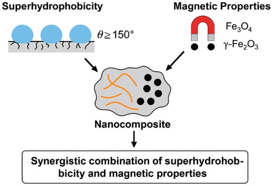 From a scientific point of view, the synergy between superhydrophobicity and magnetic properties is based on the simultaneous control of two key parameters: the surface energy and magnetic sensitivity of the material. Superhydrophobicity is provided by a hierarchically organized surface (usually micro- and nanostructured) in combination with chemically inert and water-repellent groups, such as fluorine-containing or alkyl radicals. On the other hand, magnetic properties are due to the inclusion of iron oxide nanoparticles in the structure of the material, most often magnetite (Fe3O4) or maghemite (γ-Fe2O3), which exhibit superparamagnetic behavior when the size is reduced to critical values of about 10–20 nm [28].