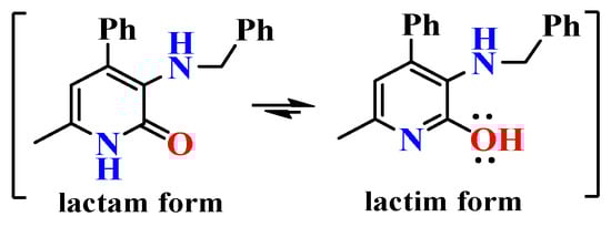 In order to find new possibilities for chemical modification of the structure of biologically active 3-(arylmethylamino)-4-phenylpyridin-2(1H)-ones 2 and to introduce another aromatic functional group into their structure, we carried out reactions with some aromatic aldehydes (benzaldehyde, 4-fluorobenzaldehyde, salicylic aldehyde) under various conditions (in a solution of polar and non-polar solvents, with the addition of acid catalysts, in a medium of phosphoric and formic acids). The main purpose of carrying out these reactions was to synthesize biologically relevant cyclic oxazolidines on the basis of 3-(arylmethylamino)-4-phenylpyridin-2(1H)-ones 2. This cyclization reaction into oxazolidines is well applicable to the example of condensation of many 1,2-aminoalcohols and their derivatives with aromatic aldehydes [27]. And since it is known that lactim-lactam tautomerism and the associated binucleophilicity are possible for our starting compounds (Figure 2), we hypothesized that these compounds might exhibit properties analogous to those of 1,2-aminoalcohols.