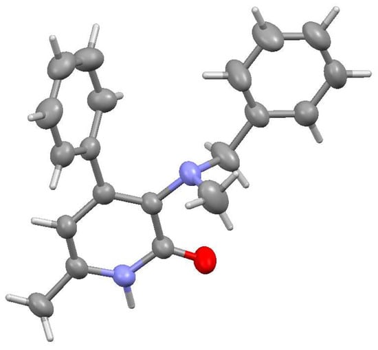 The reaction product with retention time tR = 17.79 min and content of 95% has a molecular ion peak [M]+ = 304.16 with an intensity of 40%, which corresponds to the molecular mass of the tertiary amine 9a (Figure S14 Supporting Information). The structure of this substance has been unambiguously confirmed by 1H NMR spectroscopy (Figure S8 Supporting Information) and additionally conducted X-ray structural analysis (Figure 5). In the 1H NMR spectrum of compound 9a, the methylene protons of the arylmethyl fragment are equivalent and appear as a clear singlet, indicating the absence of interaction with the NH proton, which is recorded in the initial 3-(benzylamino)-6-methyl-4-phenylpyridin-2(1H)-one 2a doublet.