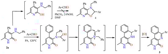 Reaction 3-(benzylamino)-6-methyl-4-phenylpyridin-2(1H)-one 2a with aromatic aldehydes.