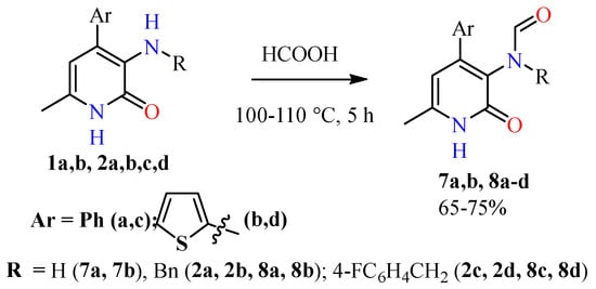 It was also found that 3-[(aryl)amino]pyridin-2(1H)-ones 2a,b under the conditions of the Leuckart–Wallach reductive amination reaction in excess formic acid form the corresponding formamides 8a–d. In this case, the reaction of 3-[(benzyl)amino]pyridin-2(1H)-ones 2a–d with other aromatic aldehydes under similar reaction conditions led only to the formation of a small amount (depending on the amount of formic acid used) of formamides 8a–d (Scheme 3). Formamides 7a,b were also synthesized by boiling in formic acid with the corresponding 3-aminopyridones 1a,b.