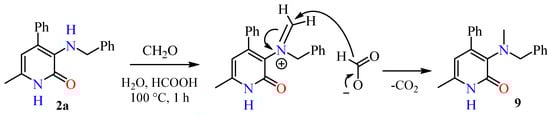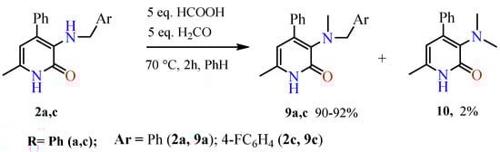 The most practical route involved a modification of the Leuckart–Wallach reaction (the Eschweiler–Clarke reaction [33,34]), as a result of which secondary 3-[(benzyl)amino]pyridin-2(1H)-one 2a interacted with formaldehyde and formic acid to form N-methylated tertiary aminopyridones 9 (Scheme 4). Formaldehyde served as both the reagent and reducing agent. The reaction proceeded for about an hour with the release (precipitation) of the target reaction product from the solution in the form of a fine crystalline white powder.