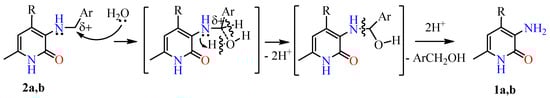 Proposed mechanism of the debenzylation side reaction of 3-(benzylamino)-6-methyl-4-phenylpyridin-2(1H)-one 2a in the Eschweiler–Clarke reaction.