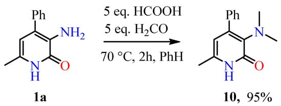 To prove the formation of N, N-dimethylaminopyridone, we performed a counter synthesis with the starting 3-aminopyridone 1a under Eschweiler–Clark reaction conditions with excess formaldehyde and formic acid (Scheme 7). As a result, N,N-dimethylaminopyridone 10 was formed in almost quantitative yield (Figure S14 Supporting Information).