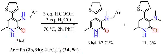 In attempts to obtain new tertiary amines with a thiophene substituent in the pyridine ring, it was found that the Eschweiler–Clarke reaction must be carried out under milder conditions, since under harsh conditions, the secondary aminopyridone 2b,d is destroyed and the tertiary amine 9b,d released decreases (Scheme 8, Figures S18 and S19 Supporting Information).