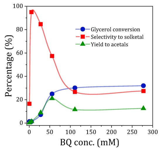 One of the main questions raised in the use of p-benzoquinone (BQ) in the photocatalyzed acetalization reaction of glycerol with acetone to produce solketal is whether BQ acts as a stoichiometric reagent, sensitizer, or as (photo)catalyst. To obtain information in this regard, photoacetalization experiments were carried out with different concentrations of p-benzoquinone, in the absence of TiO2. The p-benzoquinone concentrations that were examined were all clearly substoichiometric (ranging from 0.5 to 278 mM), given that the concentration of glycerol, the limiting reagent, was 1 M in all tests (Figure 1).