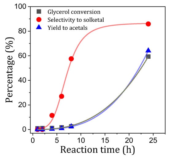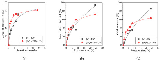 It is noteworthy that, following a 24 h reaction period, comparable glycerol conversions are attained for both reaction systems. However, the yields of acetals are notably lower for the P25/BQ system (Yacetal = 64%) in comparison to those obtained for BQ (Yacetal = 85%). This behavior suggests that the presence of TiO2 introduces secondary reaction pathways as a result of the interaction of organic compounds with the holes generated on the surface of TiO2 under UV irradiation (photodegradation). This degradation has the potential to affect both glycerol and the acetals formed during the process. Furthermore, this degradation may be accentuated at high reaction times as a result of the formation of reactive oxygen species (ROS) from the water formed as a by-product during photoacetalization. In fact, the oxidative degradation of glycerol under UV irradiation in the presence of TiO2 has been widely reported and typically involves the formation of oxygenated intermediates such as glyceraldehyde, glycolaldehyde, dihydroxyacetone, formic acid, and acetic acid, eventually leading to CO2. These non-selective oxidation pathways are promoted by photogenerated holes and surface-bound •OH radicals, and may compete with the desired photoacetalization process, thus reducing the selectivity of the reaction. A recent study by Herrera-Beurnio et al. demonstrated that glycerol oxidation on TiO2 under UV light leads to the accumulation of several of these intermediates [28]. The use of BQ alone prevents such undesirable reactions, ultimately maintaining a more controlled and selective environment for the formation of solketal as the main product.
