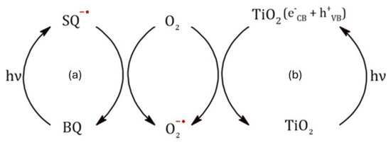Proposed mechanism of superoxide radical formation after irradiation with UV light in the presence of (a) p-benzoquinone or (b) TiO2 as photocatalyst.