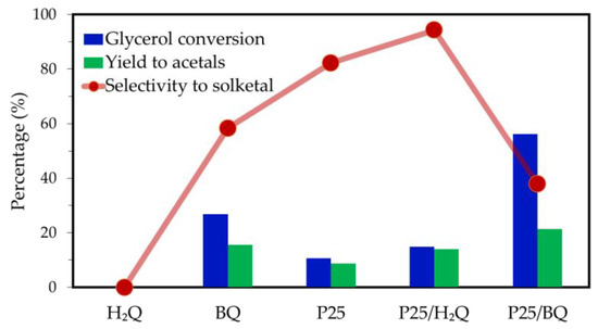 Regarding solketal selectivity, the P25/H2Q combination demonstrates high selectivity (Ssolketal, 94%), while reactions occurring in the presence of P25/BQ exhibit significantly lower selectivity (Ssolketal, 38%). Consequently, while the P25/BQ combination converts glycerol partly to reaction products other than solketal, the P25/H2Q tandem minimizes the conversion of glycerol to by-products. The behavior of the P25/BQ system can be explained by considering the interaction of BQ with the photogenerated electrons in TiO2, in such a way that BQ acts as a redox mediator that facilitates the closure of the oxidation–reduction cycle through its reduction to H2Q (Equation (7)). Concurrently, the holes photogenerated in TiO2 are primarily utilized to oxidize glycerol to by-products, thereby completing the cycle. This process increases glycerol conversion but diverts the reaction towards oxidation pathways that do not favor solketal formation. As a result, there is a decrease in solketal selectivity and acetal yield.