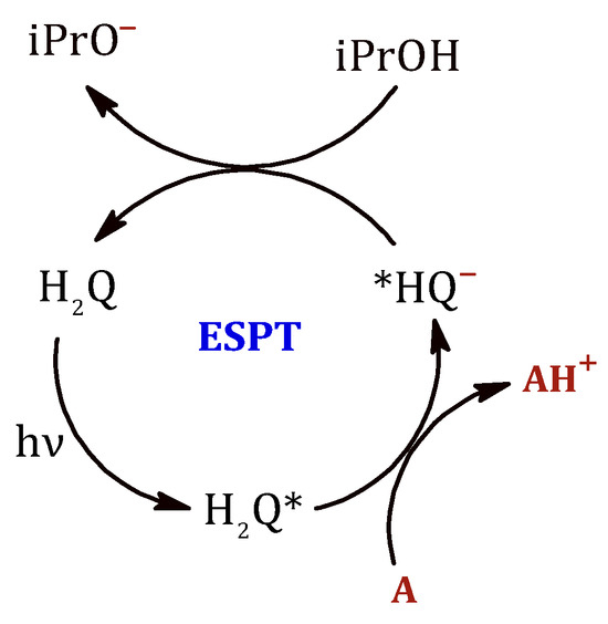 The formation of the 2-hydroxypropan-2-yl radical can be explained by a hydrogen atom abstraction from propan-2-ol by excited p-benzoquinone following a direct hydrogen atom transfer process (HAT), as illustrated in Figure 11 [46,47]. The hydrogen atom transfer (HAT) process is a key step involved in various chemical, environmental, and biological processes [48,49]. As reported by Manfrotto et al., the triplet state anthraquinone has the ability to abstract hydrogen atoms with high efficiency from alcohols, acetals, and even alkanes, thereby generating carbon-centered radicals [50].