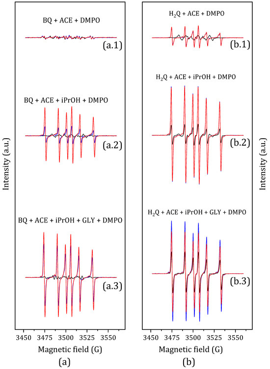 EPR spin-trapping experiments with DMPO of (a) p-Benzoquinone solutions: (a.1) BQ in acetone, (a.2) BQ in acetone and propan-2-ol, and (a.3) BQ in acetone, propan-2-ol, and glycerol; (b) Hydroquinone solutions: (b.1) H2Q in acetone, (b.2) H2Q in acetone and propan-2-ol, and (b.3) H2Q in acetone, propan-2-ol, and glycerol. The samples were exposed to UV light for one minute (black line), 10 min (blue line), and 15 min (red line). All spectra are on the same scale.