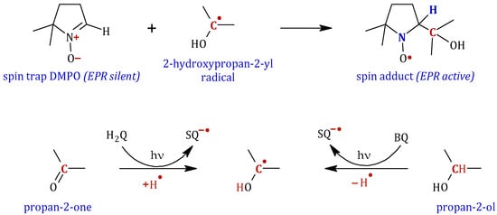Detail of the formation of the adduct of 2-hydroxypropan-2-yl radical with the spin trap DMPO. Proposed mechanism for the formation of this radical from acetone, with the intervention of hydroquinone, or from propan-2-ol with benzoquinone under UV irradiation.