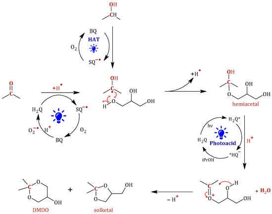 In light of the results discussed above, a reaction mechanism can be proposed for the photoacetalization of acetone with glycerol in the presence of p-benzoquinone or hydroquinone. According to the findings of previous studies [16], the presence of oxygen is necessary for the reaction to occur, thus suggesting the involvement of the superoxide radical in the process. In addition, EPR has provided evidence of the formation of the 2-hydroxypropane-2-yl radical, which can be formed from both acetone and propane-2-ol. Finally, it has been proven that, under reaction conditions, hydroquinone behaves as a photoacid, capable of transferring a H⁺ to an acceptor molecule, while benzoquinone can participate in direct hydrogen transfer (HAT) processes, responsible for the activation of C-H bonds and the formation of carbon-centered radical species.