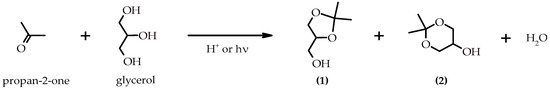 - Hidalgo-Carrillo, J.; Estévez-Toledano, R.C.; López-Tenllado, F.J.; Bautista, F.M.; Urbano, F.J.; Marinas, A. Fourth Generation Synthesis of Solketal by Glycerol Acetalization with Acetone: A Solar-Light Photocatalytic Approach. J. Taiwan Inst. Chem. Eng. 2021, 125, 297–303. [Google Scholar] [CrossRef]