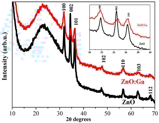 XRD patterns of the sol–gel ZnO and ZnO:Ga films with four layers, obtained from glass and annealed at 400 °C, are presented in Figure 1. The observed XRD lines indicate a crystallization of the films. The positions of XRD peaks correspond to the I wurtzite crystal phase (according to PDF 00-036-1451).