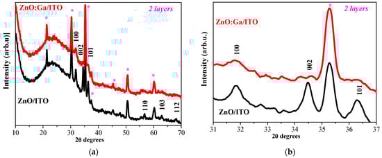 (a) presents XRD patterns of sol–gel two-layered ZnO (black line) and ZnO:Ga films (in red) annealed at 400 °C, and (b) shows an enlarged view of the three main XRD peaks. The substrate is ITO-covered glass. The asterisk marks XRD lines of ITO (PDF 01-083-3350) due to the substrate used.