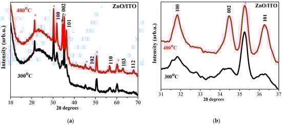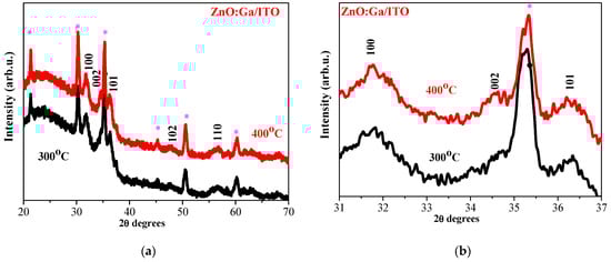 (a) XRD patterns of sol–gel four-layered ZnO:Ga films annealed at 300 and 400 °C; (b) enlarged view of the three main XRD peaks. The substrate is ITO-covered glass. The asterisk marks XRD lines of ITO coating (PDF 01-083-3350).