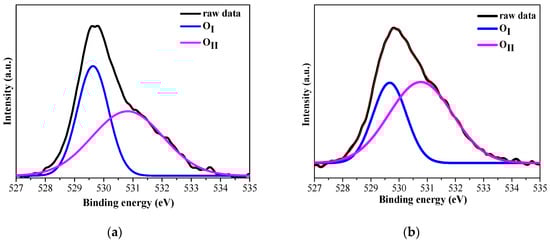 XPS spectra of O1s of (a) ZnO and (b) ZnO:Ga films deposited on ITO-coated glass and annealed at 400 °C. The colored curves correspond to the to the deconvoluted components.
