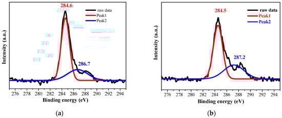 The C 1s spectrum was fitted with two contributions (see Figure 6). The peak at 284.5 eV is due to C–C bonding mostly due to adventitious carbon contamination. The second peak, positioned at 286.7 eV for ZnO (Figure 6a) and at 287.2 eV (Figure 6b) for ZnO:Ga, is attributed to C–O bonds probably related to surface oxidation or to the air exposure [18].