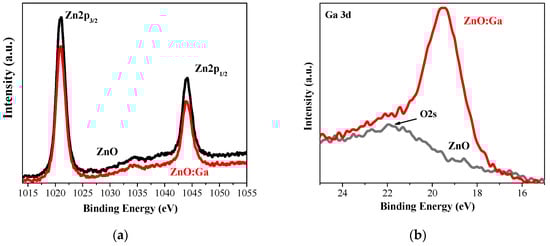 The core-level spectra of Zn2p were analyzed in detail. The binding energy values are agreed with the literature values [15,16]. The 23.08 and 23.1 eV spin-orbit splitting for Zn 2p1/2 and Zn 2p3/2 confirms that Zn atoms are in a fully oxidized state and correspond to wurtzite ZnO [19] in ZnO and ZnO:Ga films, respectively. An XPS study clearly proves the presence of Ga in doped sol–gel films. Ga 3 d5/2 is located at 19.59 eV (see Figure 7b). The specific binding energy value and its position in the XPS spectrum are indicative of the chemical environment and oxidation state of gallium. A binding energy of 19.59 eV is characteristic of Ga3+ ions in gallium oxide and when Ga atoms are substituting Zn in the ZnO lattice [20]. It can be assigned as Ga(Zn)−O bonding [20].