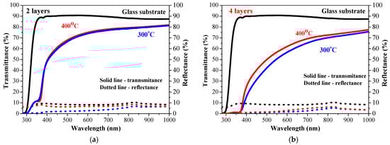 Transmittance and reflectance spectra of sol–gel ZnO:Ga films with (a) two and (b) four layers obtained on glass substrates. The films are annealed at 300 (blue lines) and 400 °C (red lines). The transmittance and reflectance spectra (in black color) of a bare glass substrate are given for comparison.