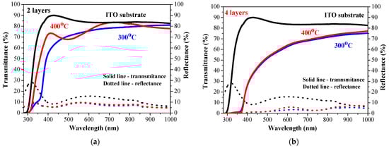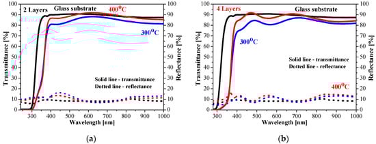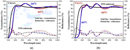 Figure 8 presents the transmittance and reflectance spectra of undoped two-layered ZnO films (Figure 8a) and four-layered ZnO films obtained from glass substrates. The reflectance of the films is below 10%. The transparency is slightly decreased by increasing the number of layers. This is attributed to the fact that absorption is closely related to thickness—absorption diminished exponentially as the film thickness decreased, and thus, transparency was improved. The same tendency is observed for ZnO films obtained from ITO (see Figure 9). ZnO films deposited on an ITO substrate possess transmittance change from 74% (two layers, Figure 9a) to 55% (four layers, Figure 9b) at a wavelength of 550 nm. Thicker films (four layers) on glass reveal negligible change in transparency by increasing the annealing temperature from 300 to 400 °C, as shown in Figure 8a. The two-layered ZnO films on ITO treated at 400 °C show a transmittance (at a wavelength of 550 nm) of 74.5% similar to 74.0% of a 300 °C annealed sample (Figure 9a). Two-layered ZnO films, annealed at a higher temperature, show an interference spectrum, an indication of better film crystallinity. An XRD study confirms this statement.