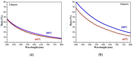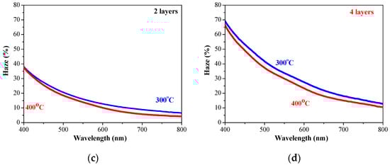 Spectral dependence of haze values of sol–gel ZnO films (a,b) with two and four layers obtained from a glass substrate and (c,d) haze values of two- and four-layered ZnO films deposited on ITO-covered glass. The films are annealed at 300 (blue lines) and 400 °C (red lines).