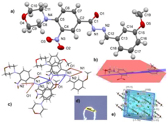 Ortep view on molecule 15 with atom numbering scheme (a), side view of the molecule (b), bifurcated N1-H1…O1 and N1-H1…N2 hydrogen bonds (c), crystal form (d), and morphology with Miller indices of main crystal faces (e).