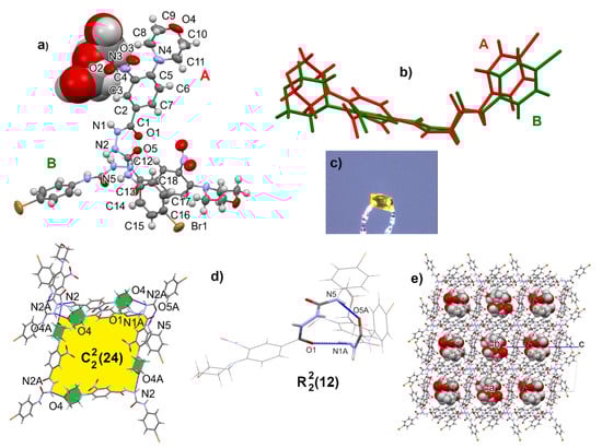 Ortep view on molecules A and B of compound 23 in a methanol solvate with atom numbering scheme given for molecule A (a), overlap of two symmetrically independent molecules (b), crystal form (c), hydrogen bonding motifs (d), and clathrate structure with methanol molecules inside (e).