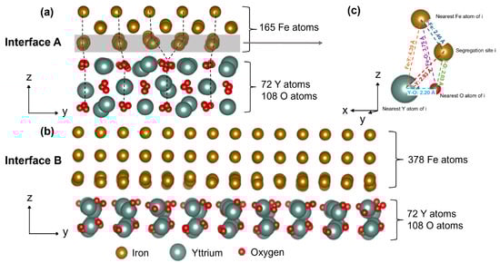 Two bi-layer supercells (interface A and B) were created for electronic structure calculations to investigate the solute segregation behavior at the Fe/Y2O3 interface in this study. Interface A (Figure 1a) consists of three layers of Fe and three layers of Y2O3 on either side of the interface. It was previously observed [17] that increasing the number of layers of metal and oxide from three to four in the case of interface A only has a minimal effect on the atomic structure and defect property at the interface. The Fe side contains 165 atoms in total, with 55 atoms in each layer, while the Y2O3 part includes 180 atoms, with a Y:O ratio of 2:3. The OR at interface A is [001]Fe||[100]Y2O3 and (010)Fe||(011)Y2O3, using the atomic structure reported in [16,17]. At interface A, a misfit dislocation is observed along the y-axis, as six columns of Fe atoms correspond to five columns of O atoms. A misfit dislocation is also present along the x-axis, where eleven columns of Fe atoms align with twelve columns of O atoms. The distance between the Fe and Y2O3 layers of interface A is determined using the interlayer distance of Fe, as reported in a previous publication [17]. In addition to interface A, interface B was created with OR, [010]Fe||[101]Y2O3 and (101)Fe||(010)Y2O3, as observed experimentally [25] (Figure 1b). At interface B, the three Fe layers consist of 378 atoms (126 atoms in each layer), while the yttria layers consist of 72 and 108 atoms of Y and O, respectively. For interface B, the distance between the Fe and Y2O3 layers was varied, and the structure with minimum energy was chosen for subsequent calculations (see Supplementary Figure S1 from the Supplementary Materials). Both interfaces A and B were optimized along the x and y directions, and the minimum energy structure was chosen for subsequent segregation energy calculations. The top and bottom layers of both oxide and metal in these two interfaces were kept fixed to mimic bulk-like conditions.