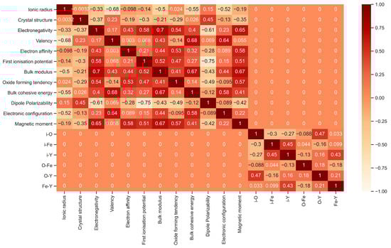 Figure 2 presents the results of the Kendall rank correlation coefficient analysis in the form of a heatmap for all 18 features. The features are listed along both the vertical and horizontal axes. The values in the heatmap indicate the Kendall correlation coefficient (τ) between the features corresponding to the vertical and horizontal directions. In Figure 2, geometry–chemistry feature pairs and geometry–strain energy feature pairs show no correlation (τ = 0), as expected intuitively. The geometry group of features is derived from the local structure of the segregation site, including the distances between the segregation site and neighboring atoms. The chemistry group of features consists of features related to the solute’s chemical properties. As such, the geometry features are based on the atomic structure of interface A, which is independent of the solute type.