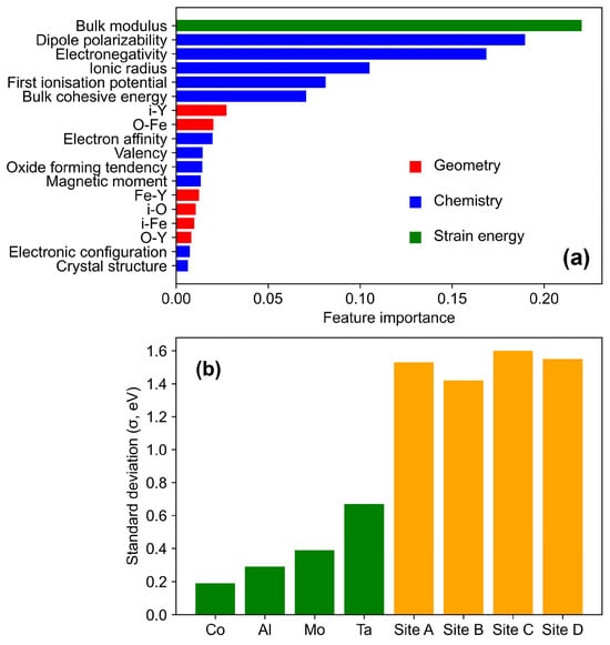 In Figure 3a, the features are ranked according to their importance, from high to low, illustrating the relative contributions of geometry, chemistry, and strain energy in affecting E S e g . In this figure, a higher feature importance value indicates a stronger influence of the feature in determining E S e g [38]. The top six most important features all belong to the chemistry and strain energy groups, demonstrating that these factors play a more dominant role than geometry features in predicting E S e g . To further understand the relative role of chemistry/strain energy-related features and geometry-related features, the standard deviation ( σ ) in E S e g for the 28 solutes at a particular site, as well as the σ in E S e g for each solute across 14 sites, were both calculated. The σ values of four solutes and four segregation sites are randomly chosen and presented in Figure 3b. In this figure, the σ of E S e g among solutes, when the geometry-related features are fixed (i.e., 28 solutes at the same site), is much larger than the σ of E S e g among sites when chemistry and strain energy-related features are held constant (i.e., the same solute across 14 sites). This indicates that E S e g is more sensitive to the chemistry of the solute and the local strain energy than to the local geometry. This implies that the tendency of solutes to segregate from bulk Fe to the metal/oxide interface is higher compared to the in-plane variation in segregation tendency among different Fe sites, which was effectively captured by our ML model.