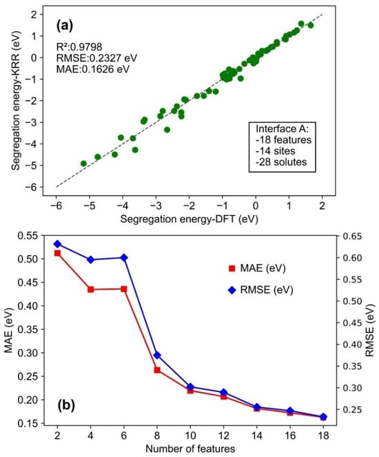 Additionally, several other KRR models were trained to examine the impact of the number of features on model performance. Comparisons of MAE and RMSE against the number of features for each model are shown in Figure 4b. Nine machine learning models were trained using different numbers of input features (2, 4, 6, 8, 10, 12, 14, 16, and 18). For models utilizing fewer than 18 features, only features with the highest importance in Figure 3a were selected. This feature selection ensured that the most informative variables were prioritized when constructing models with reduced feature sets. Further details regarding the performance of each model can be found in Supplementary Table S2 within the Supplementary Materials. It is found that both MAE and RMSE follow a similar upward trend as the number of features decreases from 18 to 2 in Figure 4b. This trend indicates that a larger number of features can better capture the relationship between the features and the segregation behavior at the Fe/Y2O3 interface, thereby enhancing the performance of the ML model with lesser prediction errors for E S e g . In Figure 4b, both MAE and RMSE show significant changes in error as the number of features increases from two to eight, but, after that, the decline becomes smoother. It can be concluded that a feature size between 8 and 12 strikes a good balance between model performance and complexity for the KRR model.