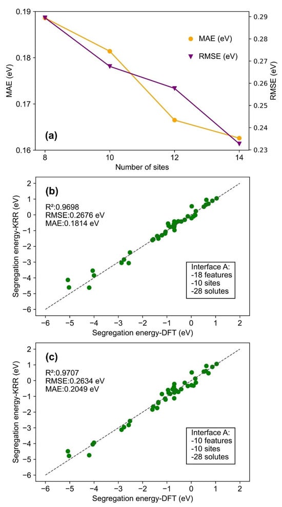 The next step is to investigate the impact of sample size on the performance of ML models. While the models discussed so far are based on data calculated from 14 sites at interface A, in this section, we explore the role of the number of sites in the dataset and its effect on the accuracy of ML-predicted E S e g . In this regard, the number of segregation sites in the datasets was decreased incrementally from 14 to 8 sites (in a step of 2) by randomly selecting the sites equally between the coherent and misfit regions, while keeping the number of solutes fixed at 28. The performance of these KRR models is presented in Figure 5a. The detailed performance metrics for these models can be found in Supplementary Table S3 within the Supplementary Materials. As the number of sites considered is decreased from 14 (392 E S e g ) to 10 (280 E S e g ), RMSE and MAE are both increased by 15.00% (from 0.2327 eV to 0.2676 eV) and 11.56% (from 0.1626 eV to 0.1814 eV), respectively.