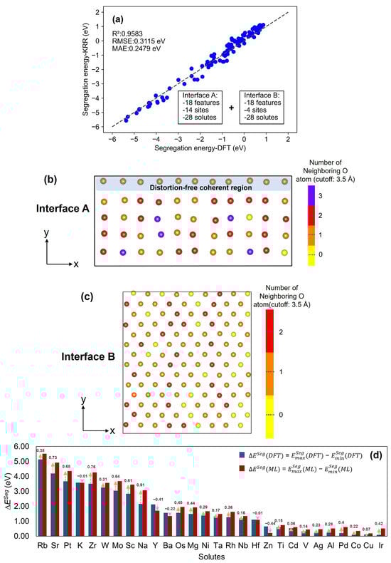 Figure 6. (a) KRR model performance of interface B: predicted E S e g vs. computational E S e g from the optimized KRR model with third-order polynomial kernel: (training set from interface A and test set from interface B); (b) map of number of neighboring O atoms at the interfacial Fe sites of interface A (cutoff: 3.5 Å); (c) map of number of neighboring O atoms at the interfacial Fe sites of interface B (cutoff: 3.5 Å); (d) comparison of E S e g in DFT and ML analysis (interface B), where green arrows indicate cases where E S e g ( M L ) exceeds E S e g ( D F T ) , and pink arrows indicate cases where E S e g ( M L ) is less than E S e g ( D F T ) .