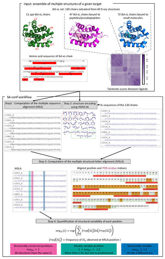 Overview of the SA-conf workflow. SA-conf takes as input a diverse set of structures of the same protein. In this study, it was applied to a dataset of 130 Bcl-xL chains derived from 60 X-ray crystal structures, including 11 apo forms and 119 holo forms complexed with peptides, pseudo-peptides, or small molecules (Appendix A Table A1). To characterize the sequence diversity of the dataset, the aligned amino acid sequence of the wild-type Bcl-xL chain (from the multiple sequence alignment of all chains) is shown. Underlined residues indicate positions with amino acid substitutions across the dataset. Red boxes denote the locations of -helices. Ligand diversity is illustrated by the matrix of pairwise Tanimoto coefficients computed between co-crystallized ligands, highlighting their chemical similarity. Darker purple squares indicate higher similarity between ligands. The SA-conf pipeline consists of four main steps. Step 1: Extraction of amino acid sequences from all PDB files and computation of a multiple sequence alignment (MSA). Step 2: Encoding of local backbone geometry using the HMM-SA structural alphabet, which transforms each structure into a sequence of structural letters (SLs), each representing the conformation of a four-residue fragment. Step 3: Generation of a multiple structural letter alignment (MSLA) by integrating the MSA with structural encodings. More precisely, SA-conf transforms the MSA into an MSLA by replacing each MSA residue with its corresponding structural letter. A mapping between aligned positions (black) and corresponding residue numbers (green) in the 1MAZ (PDB code) structure is provided. Red boxes mark -helix positions. Step 4: Quantification of local structural variability using the Shannon entropy exponent () for each aligned position. Based on the values, three categories of structural variability are defined: (i) structurally conserved positions (), where all structures adopt the same local conformation; (ii) weakly variable positions (), where one conformation dominates with rare deviations; (iii) structurally variable positions (), where multiple conformations are sampled across the dataset.