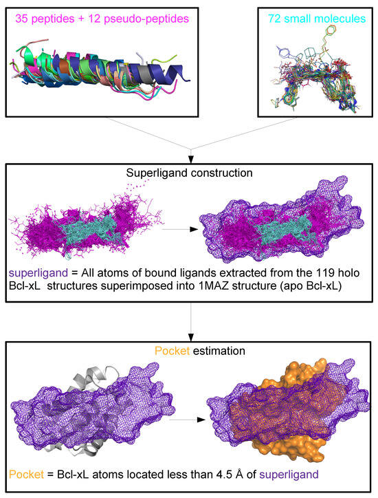 The ligand binding site of each Bcl-xL chain was estimated using the superligand method [15], presented in Figure 3. This method was chosen for its ability to account for ligand diversity in terms of size, type (small molecules, peptides, and pseudo-peptides), and flexibility. In this approach, the binding pocket is defined as the larger region of Bcl-xL capable to bind any ligand observed in the dataset. The method begins with the construction of the superligand. To do so, each Bcl-xL chain was superimposed into the arbitrarily selected reference chain 1MAZ_A. From the superimposed complexes, a total of 119 ligands were extracted: 72 small molecules, 35 peptides, and 12 pseudo-peptides. The superligand was generated by merging the 119 superimposed ligands. Therefore, this composite ligand reflects the structural diversity and flexibility of all ligands known to bind Bcl-xL. The resulting superligand comprises 14,110 atoms. The next step consisted in estimating the binding pocket from the 3D structures. To this end, the superligand was positioned within the 130 aligned Bcl-xL chains (apo and holo). Each pocket was defined as all Bcl-xL atoms located within 4.5 Å of the superligand (Figure 3). Using this method, 130 pockets were extracted, containing on average 334.01 ± 19.84 atoms and 54.78 ± 3.33 residues.