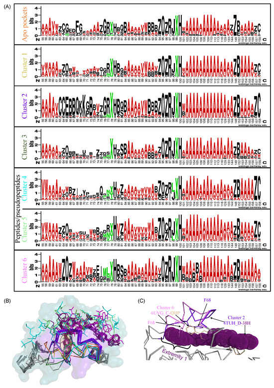 Ligand-induced structural rearrangements in the Bcl-xL binding site. (A) Structural letter logos of the Bcl-xL binding site, grouped by ligand clusters. Each column corresponds to an aligned position of the consensus pocket. Stacked letters indicate the relative frequencies of structural letters at that position across all structures. Letter height reflects structural letter frequency, total stack height of the stack reflects structural letter conservation in bits. Structural letters were colored according to the secondary structures: -helix structural letters in red, -strand structural letters in green and loop structural letters in black. Logos were generated using WebLogo [27]. (B) Structural visualization of the 61–71 (aligned positions) region across the six ligand-binding clusters. The common binding site is displayed in the surface and colored in gray. The 61–71 region is colored according to ligand clusters (see panel (A)). Co-crystallized ligands are displayed in stick mode and colored according to ligand clusters. (C) Superposition of the binding pockets from two representative complexes: 4TUD (cluster 2) and 6UVG (cluster 6). Proteins are shown in ribbon mode and colored in gray. The 61–71 region is highlighted in violet and pink for 4TUD and 6UVG structures, respectively. The 38H ligand (4TUD) is shown as violet spheres, and the QHP ligand (6UVG) as wheat-colored sticks. Residue Phe68 is displayed in stick mode.