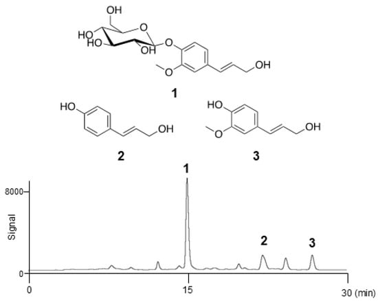 Structures of coniferin (1), p-coumaryl alcohol (2), and coniferyl alcohol (3), and the HPLC chromatogram.