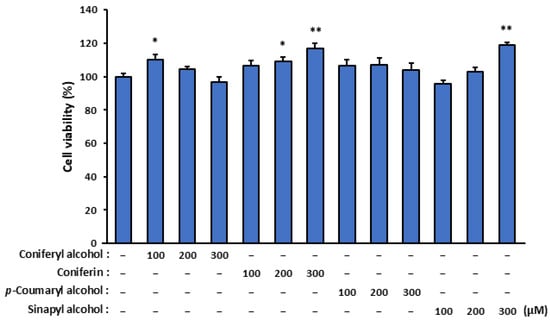 The effect of isolated cinnamyl alcohol analogues on the viability of SZ95 sebocytes. The SZ95 cells were treated with specific concentrations (100, 200, and 300 µM) of the analogues—coniferyl alcohol, coniferin, p-coumaryl alcohol, and sinapyl alcohol—for 24 h. Cell viability was assessed using a WST-1 assay. The data are presented as means ± standard error (n = 12) and were analyzed for statistically significant differences using Student’s t-test, with different letters indicating the differences at * p < 0.05 and ** p < 0.01 vs. SZ95 cells with no cinnamyl alcohol analogue treatment.