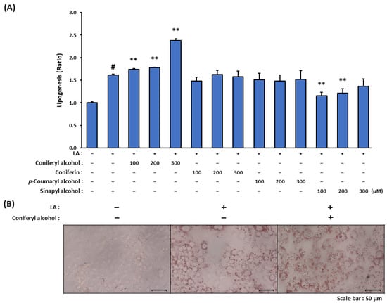 The SZ95 cells were seeded into 24-well plates (2 × 105 cells/well) and cultured for 48 h. After 48 h of incubation, the cells were pre-treated with coniferyl alcohol, coniferin, p-coumaryl alcohol, and sinapyl alcohol for 2 h at final concentrations of 100, 200, and 300 µM. Subsequently, the cells were stimulated with and without LA at a final concentration of 100 µM (Sigma-Aldrich, St. Louis, MO, USA) for 24 h. After 24 h of incubation, the culture medium was replaced with fresh medium containing 10% WST-1 (Premix WST-1 Cell Proliferation Assay System, Takara Bio Inc.). After incubation at 37 °C for 1 h, the absorbance was measured at wavelengths of 450 and 690 nm using a colorimetric microplate reader (Varioskan LUX, Thermo Fisher Scientific). The cells were then washed twice using phosphate-buffered saline (PBS)(-) and fixed in 10% formalin at 4 °C overnight. The fixed cells were also washed twice using PBS(-) and stained for 1 h using a staining solution composed of Oil Red O dye (Cosmo Bio Co., Ltd., Tokyo, Japan) and ultrapure H2O in a v/v ratio of 3:2. After the staining process, the cells were washed using distilled H2O and dried at 25 °C for 1 h. The cells stained with Oil Red O were observed under a microscope (BZ-X800, Keyence Co., Ltd., Osaka, Japan) with a 40× objective lens. The Oil Red O content dissolved in the lipid droplets was extracted using 2-propanol, after which the absorbance was measured at a wavelength of 540 nm using a colorimetric microplate reader (Varioskan LUX, Thermo Fisher Scientific). The lipogenesis (ratio) was calculated using Equation (2) as follows.