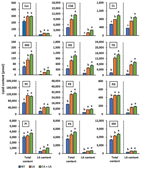 The effect of coniferyl alcohol isolated from watermelon fruit on the lipid profile in LA-stimulated SZ95 sebocytes. SZ95 cells were first pre-treated with coniferyl alcohol (300 µM) for 2 h and then stimulated with and without LA (100 µM) for 24 h. Following incubation, lipids were extracted from the cells using the Bligh and Dyer method. The 12 lipid profile classes [ceramide (Cer), cholesterol ester (ChE), cardiolipin (CL), monoglyceride (MG), diglyceride (DG), triglyceride (TG), phosphatidylcholine (PC), phosphatidylethanolamine (PE), phosphatidylglycerol (PG), phosphatidylinositol (PI), phosphatidylserine (PS), and sphingomyelin (SM)] were analyzed using liquid chromatography-electrospray ionization tandem mass spectrometry (LC-ESI/MS/MS). Total content: the total content of all lipid species including those containing various fatty acid components such as palmitic acid, stearic acid, oleic acid, and LA; LA content: content of lipid species that contain LA as one of their fatty acid components. The data are presented as means ± standard error (n = 3) and were analyzed for statistically significant differences using the Tukey–Kramer method, with different alphabets indicating the differences at p < 0.05. NT: SZ95 cells without both LA-stimulation and coniferyl alcohol treatment, LA: LA-stimulated SZ95 cells with no coniferyl alcohol treatment, CA + LA: LA-stimulated SZ95 cells with 300 µM coniferyl alcohol treatment.