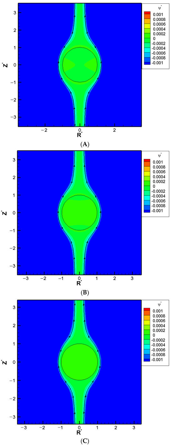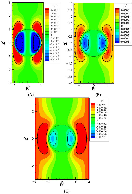 Contour plot of stream function with σH = 2.0, κa = 14.16, σ* = 2.03, and = 1.2 in the KCl solution (β = 0), where R* is the coordinate in the radial direction and Z* is the coordinate in the longitudinal direction: (A) = 1.2; (B) = 1.5; (C) = 2.0.