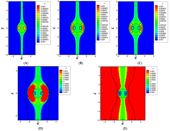 Contour plot of stream function with σH = 2.0, κa = 1, and σ* = 2.03 in the KCl solution (β = 0), where R* is the coordinate in the radial direction and Z* is the coordinate in the longitudinal direction: (A) = 3; (B) = 3.55; (C) = 4; (D) = 4.5; (E) = 5.