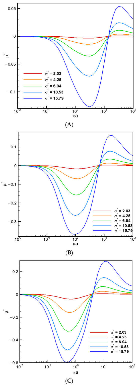 Dimensionless mobility (μ*) as a function of at various viscosity ratio σH for conducting droplets with κa = 1 in the KCl solution (β = 0). (A) σ* = 2.03; (B) σ* = 6.94; (C) σ* = 15.79.