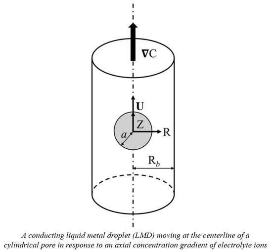 As shown in Figure 6, the diffusiophoretic motion of a charged, conducting liquid metal droplet (LMD) in a binary KCl electrolyte solution is considered here. A concentration gradient of ions, ∇C, is applied in the Z-direction which drives the droplet in motion in the same direction. The electrolyte solutions considered are assumed to be Newtonian, incompressible, and have constant material constants like viscosities and dielectric constants [25]. The surface of the conducting droplet is assumed to be mobile, ion-impenetrable, and remain spherical without deformation while in motion, which is justified by the extremely low hydrodynamic Weber number, typically around 10−7 [4]. Furthermore, the droplet surface is assumed to be equipotential, which is true for conducting droplets due to their extremely high electrical conductivity. It is also true for droplets whose surface charges are solely from ion adsorption. All the charges are assumed to be uniformly distributed on the droplet surface, and the interior fluid contains no electrolyte ions. Moreover, the surface charge density is assumed to remain constant with varying electrokinetic environments characterized by the electrolyte strength in the ambient solution. In other words, these ions are indifferent ions which will not adsorb to the droplet surface regardless of their concentrations [22,27]. Based on these assumptions, the governing equations are as follows: